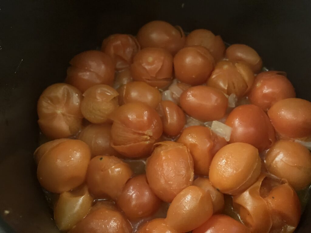 Man kann niemals genug Tomatensoßen haben. Ein Tomatensugo ist die Essenz der italienischen Küche: eine eingekochte Sauce aus Tomaten, Olivenöl, Zwiebeln und Knoblauch. Im Gegensatz zur schnellen Marinara schmort ein Sugo oft stundenlang, bis er eine tiefe, konzentrierte Süße und sämige Bindung entwickelt. Das ist die perfekte, aromatische Basis für Pasta, Pizza oder anspruchsvolle Fleischgerichte. Natürlich gibt es die besten Tomaten zur Erntezeit im Freiland, aber ich habe 10 Kilo Bio Minitomaten für 10 Euro beim Bananen Fred bekommen. Damit kann man sich auch schon mal in Winter so ein Projekt gönnen. Sobald das Wasser raus ist, kommt der Geschmack ohnehin hervor, zu jeder Jahreszeit. Alles andere ist rohes Tomatenwissen im Salat. Ich benutze meinen Krups cook 4 me, da muss ich mich um nichts mehr kümmern, wenn der Deckel zu ist. Das geht ebenfalls im Schnellkochtopf, oder konventionell mit dem Topf, dann dauert es eben länger und man muss öfter rühren. Da werden aus Stunden Kochzeit nur noch 15 Minuten Druckkochzeit plus das Erhitzen und hinterher noch das Einkochen. Es hat ja niemand behauptet, dass es hier irgendwas geschenkt gibt. Ein bisschen Aufwand bleibt immer.