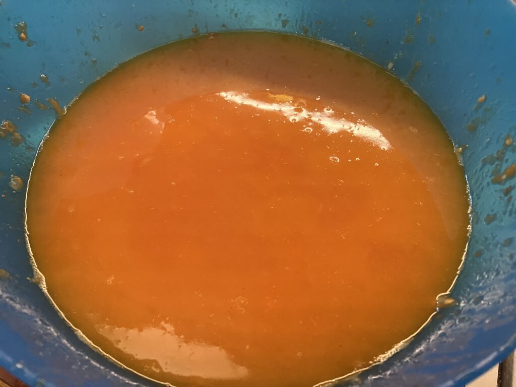 Mit einem Löffel, oder einer Kelle von oben drücken, damit die Flüssigkeit durch das Sieb geht und die Schale und Kerne im Sieb bleiben. Was man mit dem Trester anstellt, zeige ich Euch noch separat. Wir werfen den auf keinen Fall weg.