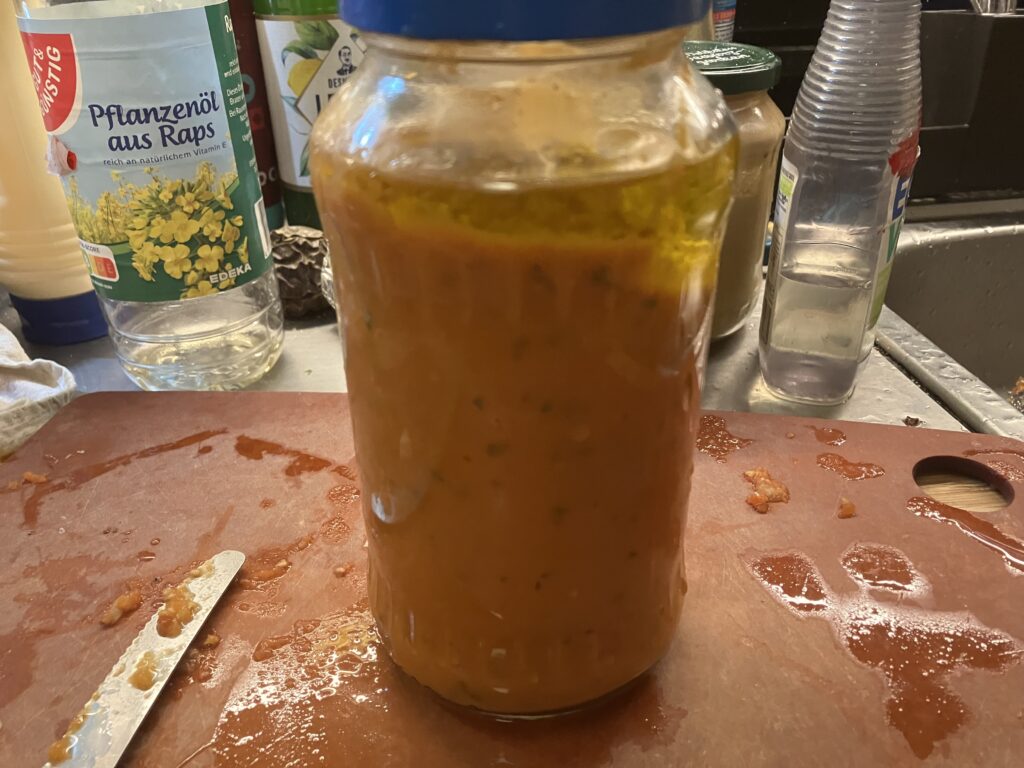 Die Tomaten werden quer durchgeschnitten und mit der Schnittfläche nach unten auf ein Backblech gegeben (Backpapier darunter ist ok). Bei 180 Grad solange garen, bis man die Haut abziehen kann. Dann zerdrückt man sie, würzt nach Belieben und “backt” sie weiter, bis sie die gewünschte Konsistenz haben. Olivenöl darf natürlich nicht fehlen. Die Sauce hält sich im Glas dann auch ne Weile.