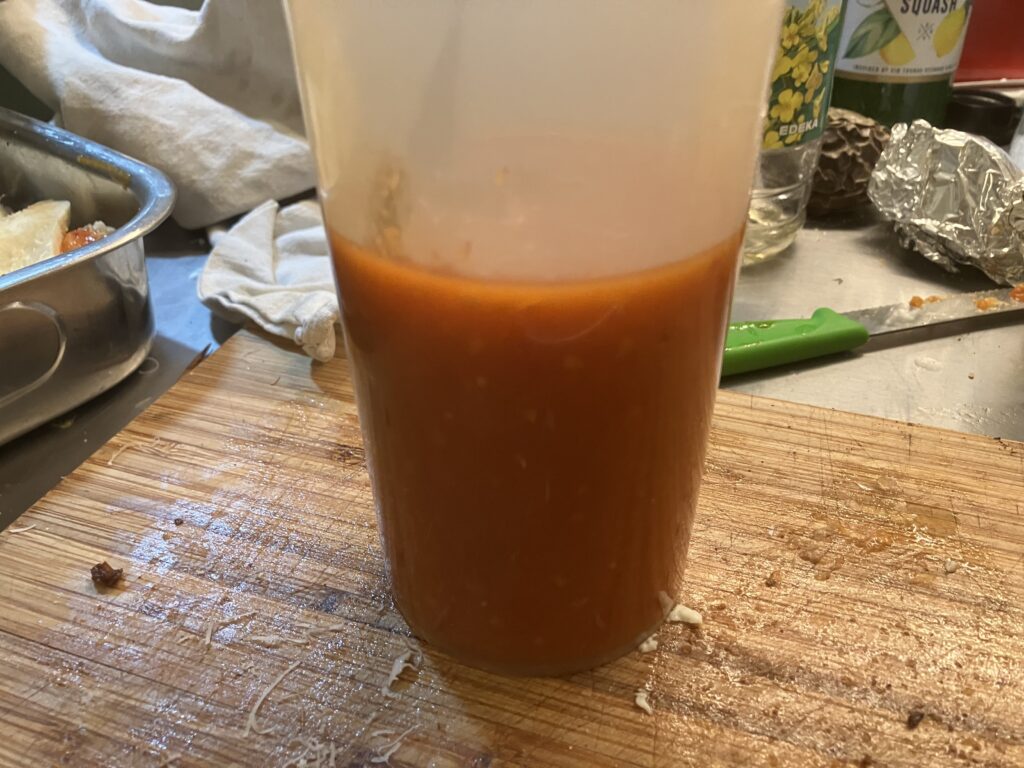 Hier sammele ich die zerkleinerten Tomatenreste aus dem Mixbecher