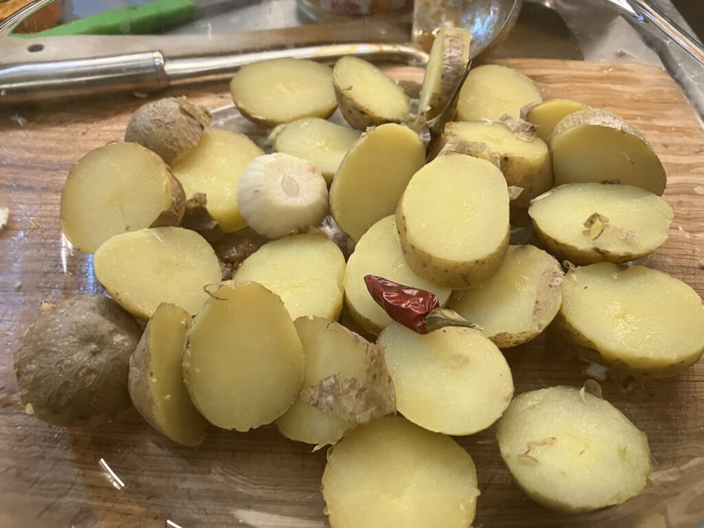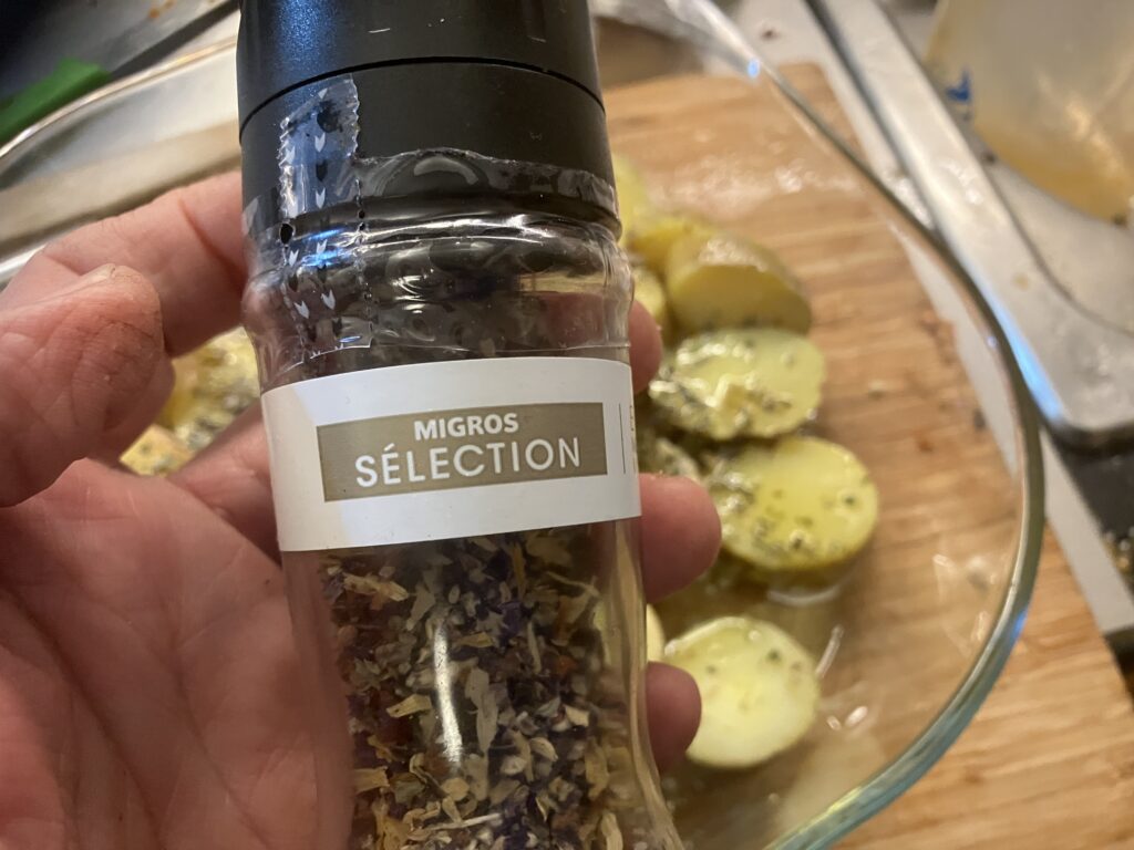 Es wurde eine einfache Kartoffelbeilage benötigt. Wie gewohnt habe ich bereits Kartoffeln am Vortag als Pellkartoffeln gegart, damit sie resistente Stärke bilden können, die den Blutzucker nicht so hochtreibt. Meine Kochfreundin E aus K hat mir freundlicherweise ein paar schöne Gewürze geschickt, die ich mir selbst nie kaufen würde, bei denen mir aber natürlich bewusst ist, dass man den Unterschied immer merkt, wenn man welche in Bioqualität verwendet, die im Morgentau von Jungfrauen geerntet wurden. Spätestens beim Geschmack merkt man das sowieso.