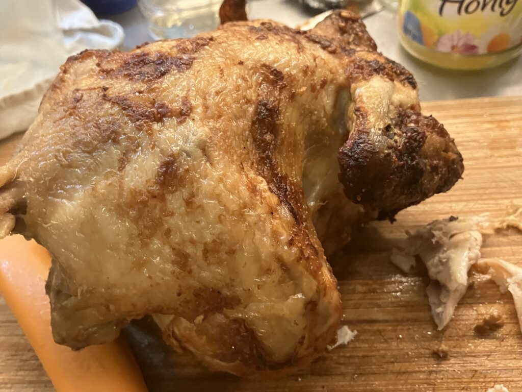 Das Huhn ist ordentlich erwärmt, zart, gut besoßt und bekäst und schmeckt so, als wenn es nie anders geplant worden wäre. So habe ich mir das vorgestellt.