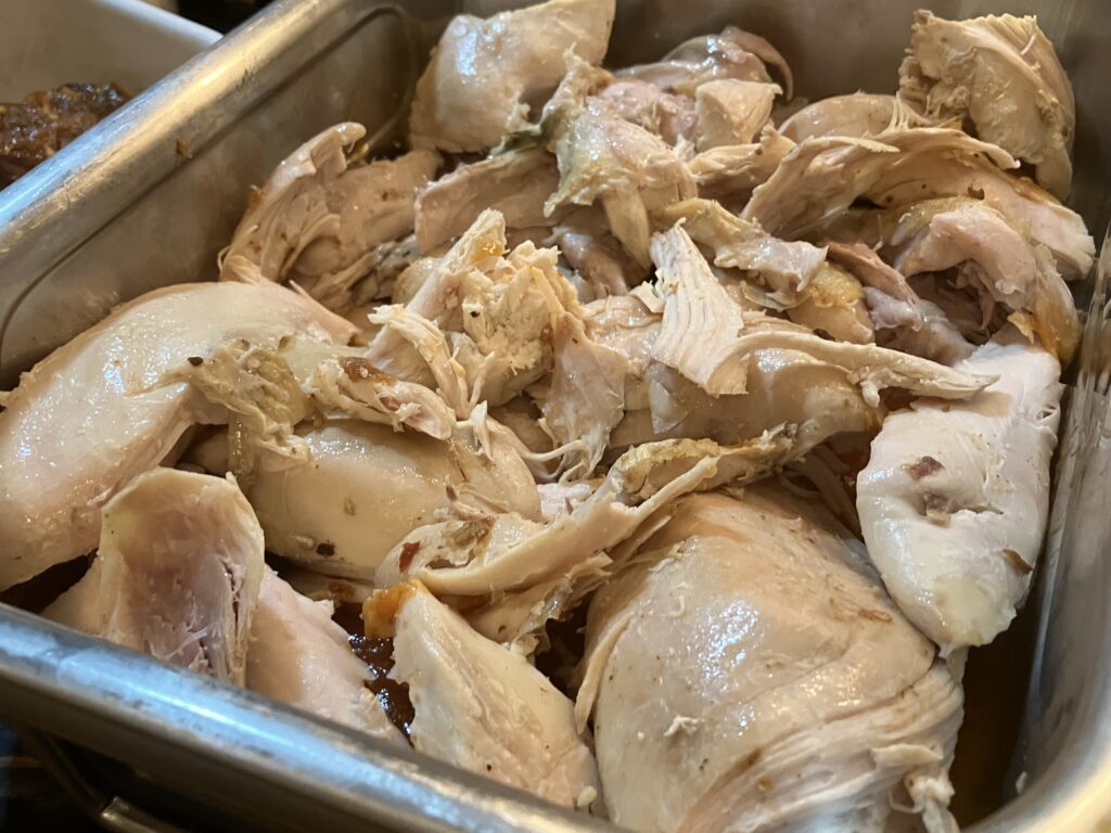 Hühnerfleisch von den Knochen trennen und die Haut abziehen