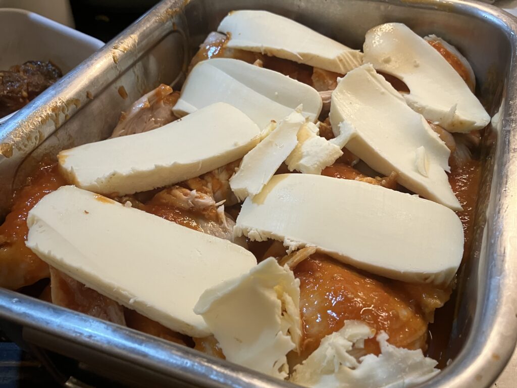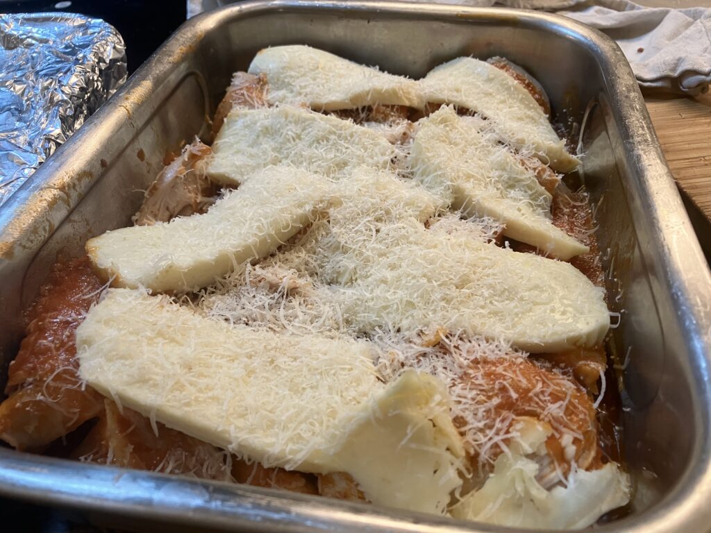 Mozzarella auf das Huhn legen