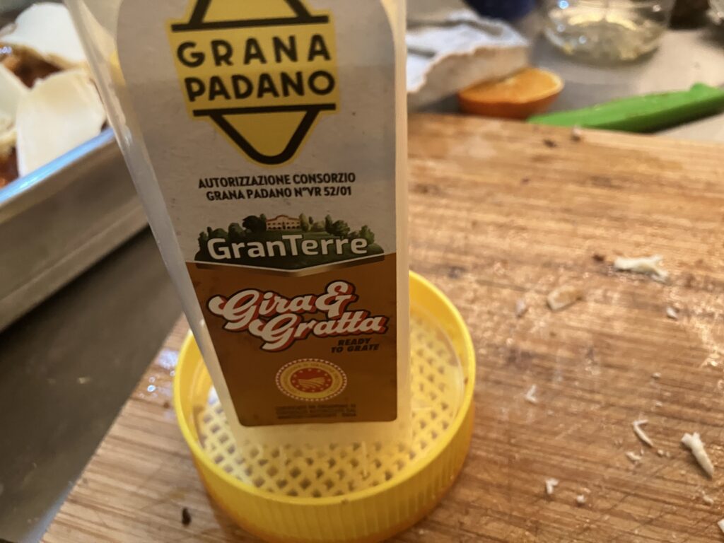 An dieser Stelle sollte ein Parmesan stehen, aber es ist nur ein Grana Padano geworden, der während ein Parmesan aus Parma ist, aus Pianura Padana kommt und auch bei der Produktion nicht identisch ist. Am nächsten kommt man der Sache, wenn man die Ähnlichkeiten darauf beschränkt, dass beides Hartkäse sind.