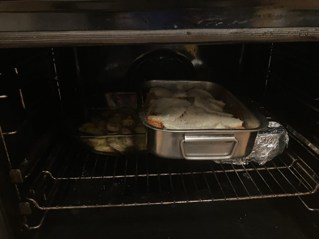 Ich habe ein Schweinefilet im Sugo zum Regenerieren im Ofen, weil Prinzessin Schnekerliese keinen Käse mag und da sind mit 10 bis 15 Minuten mehr Garzeit, auch die Ofenkartoffeln bei 200 Grad im Ofen. Das Huhn kommt bei 200 Grad Umluft für 20 Minuten in den Ofen.