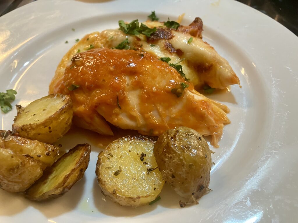 Ich hatte noch ein ganzes Grillhuhn vom Drehspieß vom Vortag zu verarbeiten. Das wollte ich nicht austrocknen, sondern wie neu regenerieren und mit einem gefühlten Mehrwert versehen. Ich finde außer nichts zu essen zu haben, gibt es nichts schlechteres, als wenn es sich nach so einem Not gegen Elend Resteessen anfühlt, das nicht auf den Punkt erwärmt ist und auch sonst nicht wie frisch für diesen Anlass gekocht rüberkommt. Ich habe ein Sugo aus frischen Tomaten gekocht, Mozzarella und geriebenen Hartkäse geben dem Gericht angenehmen Geschmack und dazu gibt es knusprige Ofenkartoffeln. Einfach und gut. Dafür lohnt es sich auch schon am Vortag mehr Huhn zuzubereiten, als man offensichtlich braucht, oder wie hier als Notausfahrt, bevor man seine Übermengen nicht sinnvoll verarbeitet bekommt.