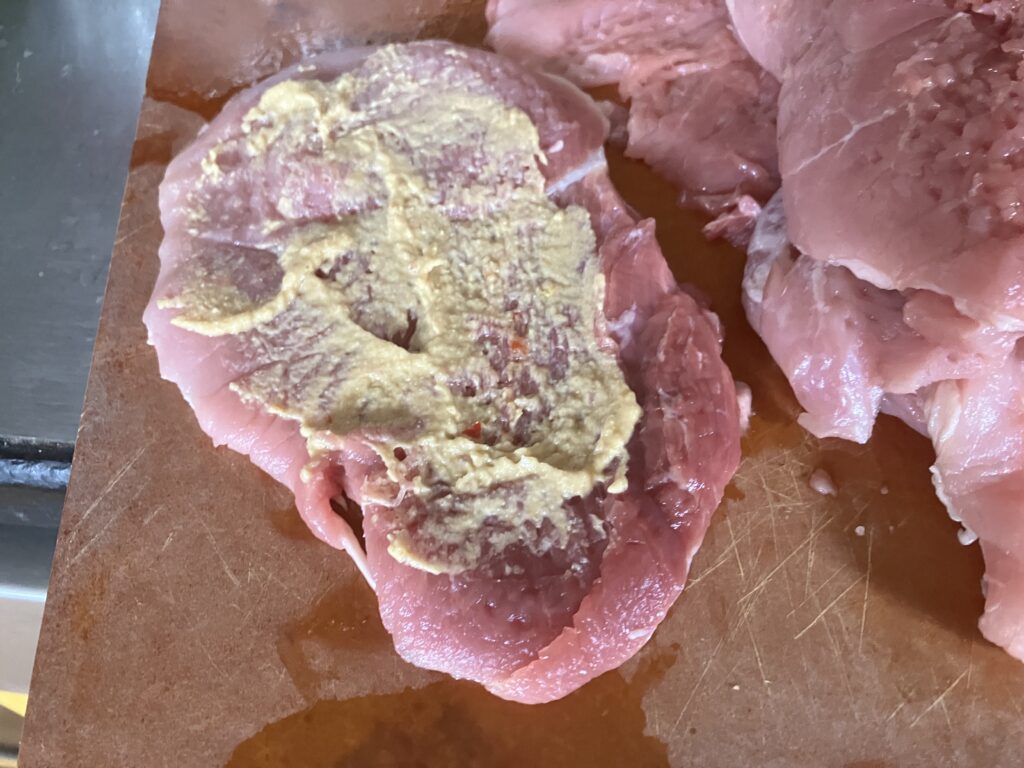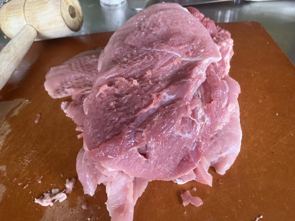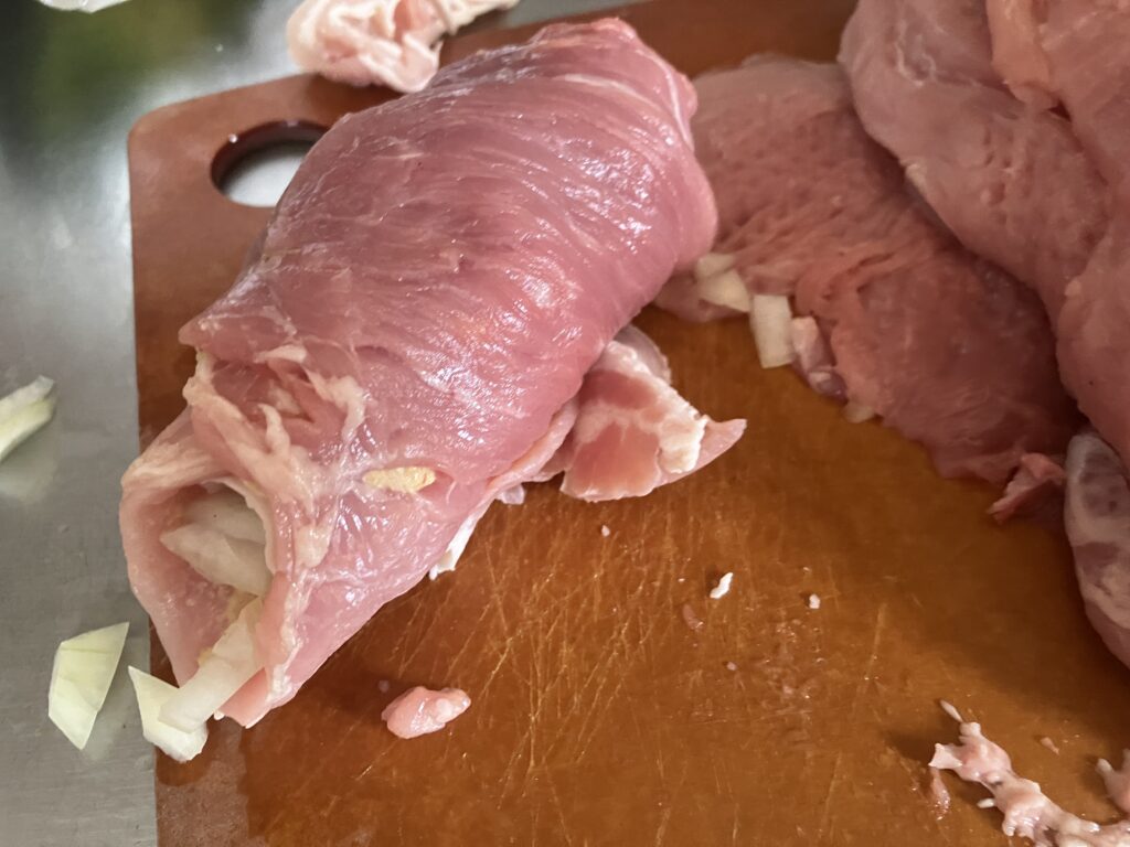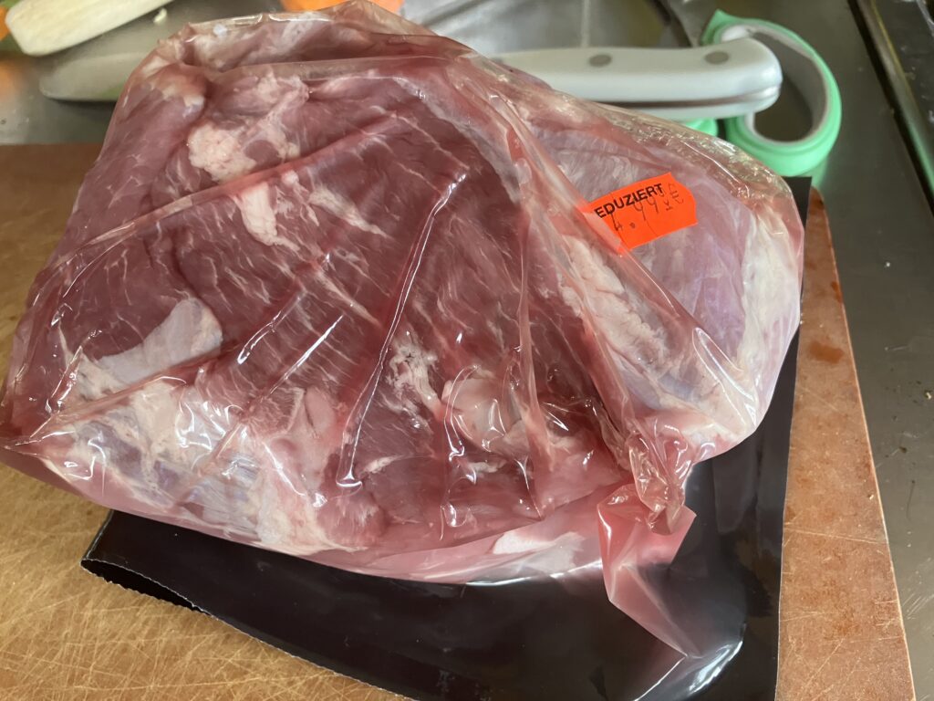Rouladen gibt es bei uns ganz selten. Meine Familie hat häufig eine Schmorgerichteabneigung, die ich gar nicht verstehe. Meistens wenn es um klassische deutsche Küche geht. Vom Rind sind die Rouladen auch richtig teuer geworden. Unter 15 Euro pro Kilo quasi nicht zu bekommen. Ich war beim Handelshof und schaue dort jedes Mal beim Fleisch im MHD Verkauf, was sie loswerden wollen. Ich habe eine Nuss vom Schwein für € 4,99 pro Kilo gekauft. Die gibt es am Stück und der Vorteil dieses Stückes ist, dass man es zu Schnitzeln, oder Steaks aufschneiden, oder als Schmorfleisch am Stück verwenden kann. Ich habe noch einen draufgesetzt und gleich noch den Metzgerjob miterledigt und Rouladen daraus geschnitten, weil mir irgendwer zugeflüstert hatte, keine Schnitzel essen zu wollen.