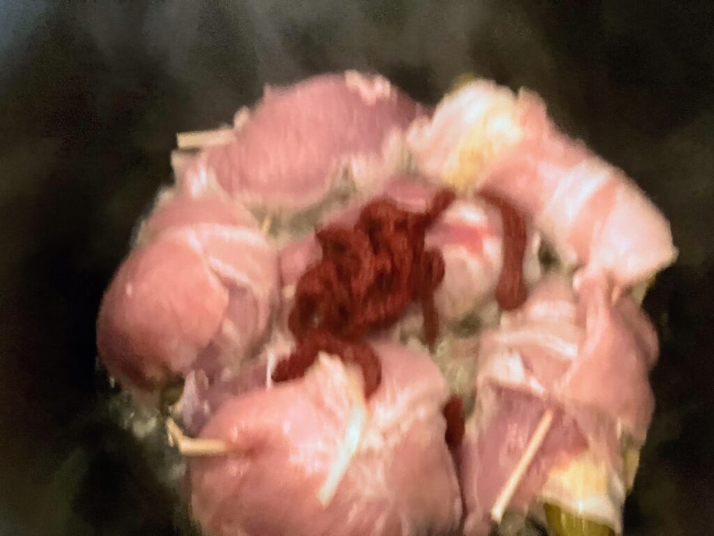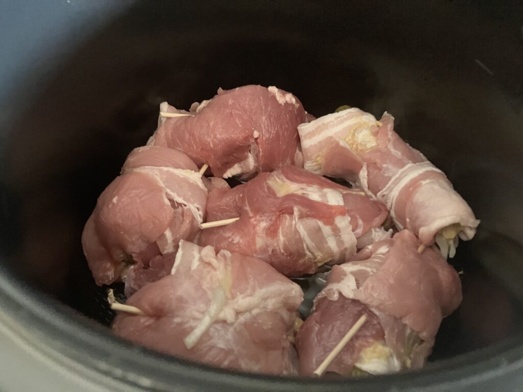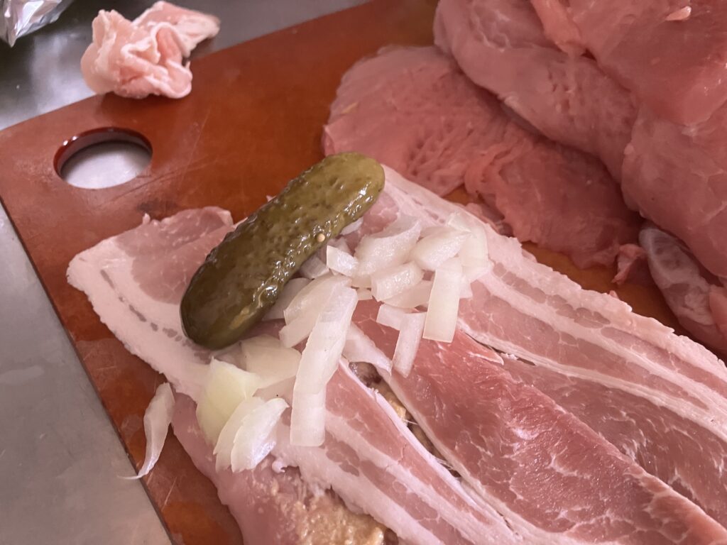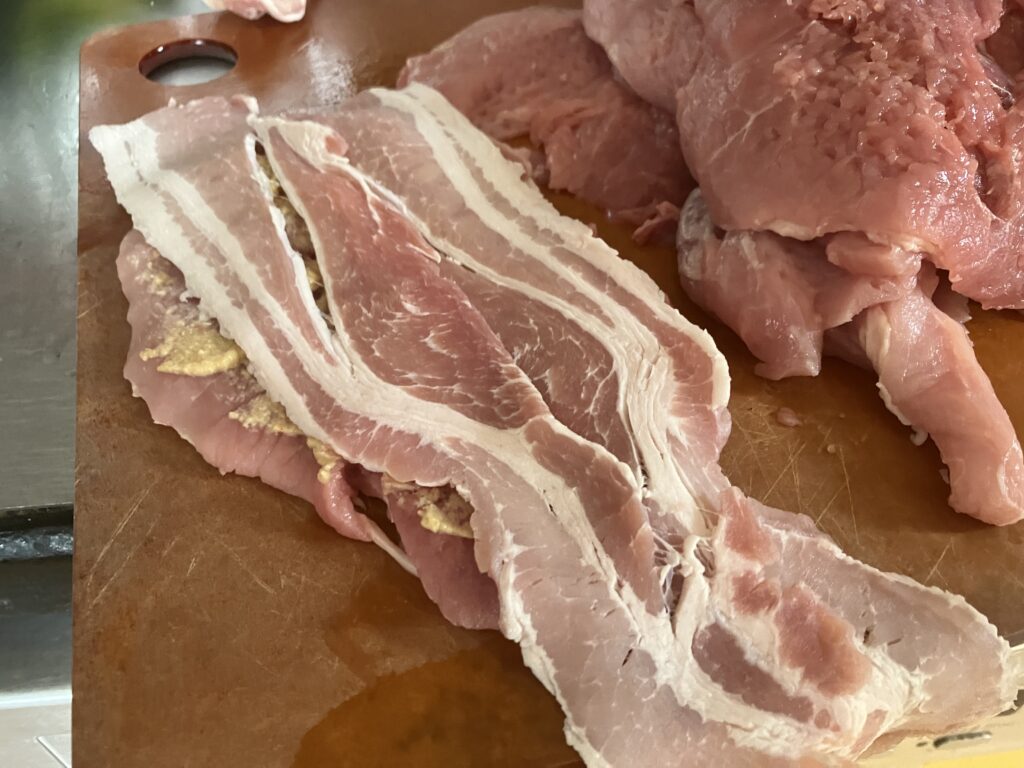 Ich habe jeweils zwei Baconstreifen auf die Rouladen gelegt