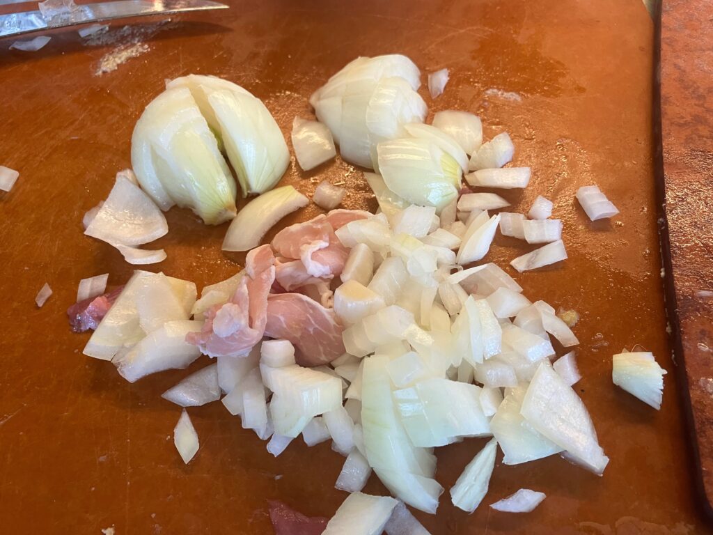 Die restlichen Zwiebelstücke und Bacon gebe ich auch noch in den Topf