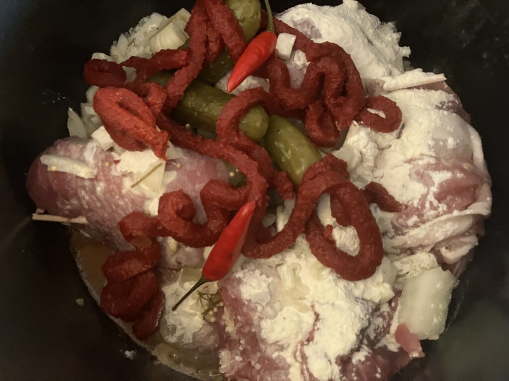 Die Soße ist einfach nach dem Druckkochen noch weiter im Cook 4 me eingekocht worden. Nichts wurde passiert, oder noch mehr gebunden. Das erledigen Tomatenmark und Mehl. Steht auch so im Text “Mir ist die Soße noch zu dünn, deswegen lasse ich sie konventionell auf der “Bratstufe” für 20 Minuten sprudelnd einkochen”. Ich habe das Fleisch einfach nur entlang der Faser aufgeschnitten und benutze gerne mein Ausbeinmesser von Victorinox, oder ein anderes mit einer glatten Schneide. Ich schärfe die Messer auch immewr, wenn sie sie für solche Feinarbeiten benutze. Ich schneide ungefähr so eine Dicke, als wenn ich Schnitzel machen wollte und den Rest klopfe ich dann dünn. Hat mich aber auch gewundert, wie einfach das geht.
