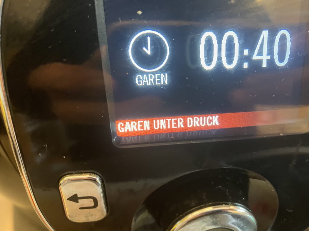 Garzeit 40 Minuten unter Druck. Ich mache mein Wirsinggemüse und mein Kartoffelgratin in der Zwischenzeit.