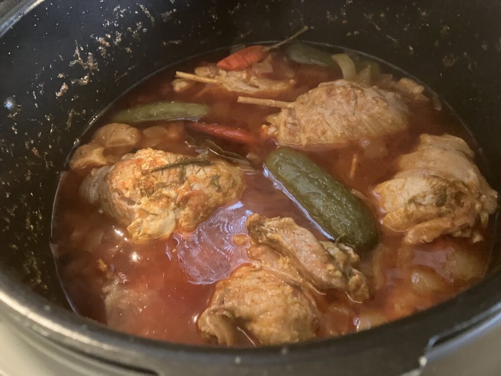 Da ich aber nicht drei Stunden schmoren wollte, sondern einen schnellen Werktagserfolg im Krups cook 4 me angestrebt habe, wurden die Rouladen alle mit Spießen zusammengehalten. Ich habe keine Ahnung was beim Garen unter Druck sonst passieren würde, deswegen gehe ich da kein Risiko ein.