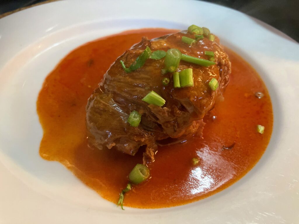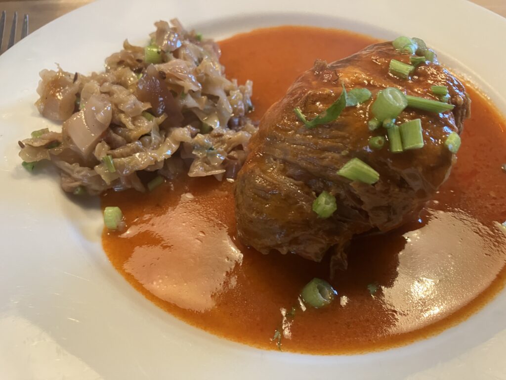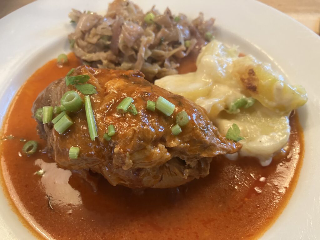 Das ist schon verdammt lecker. Sehr kräftig und rund im Geschmack, schöne Soße, ganz zartes Fleisch und wenn man das nicht erwähnen würde, käme keiner auf die Idee dass das keine Rinderroulade ist, sondern “nur” Schwein.