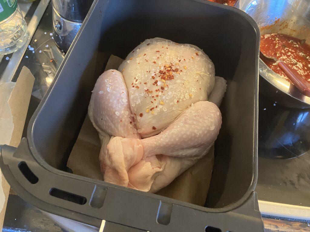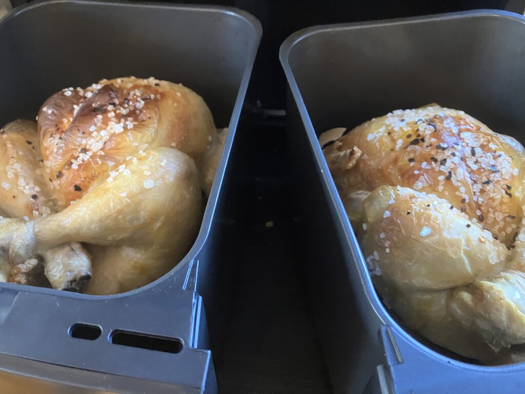 Beim Handelshof gab es Hähnchen im MHD Verkauf, ich musste die also spontan verarbeiten. Das ist ein Job für unsere neue Ninja Heißluftfritteuse. Die hat zwei Kammern, in die jeweils ein Huhn mit 1,3 Kilo Gewicht passt. Vorteil bei der Heißluftfritteuse ist auf jeden Fall dass die Hitze direkter anliegt als beim Backofen und dann man so leichter knusprige Haut erreichen kann. Ich habe eine leckere Marinade dazu angerührt, die erst gegen Ende der Garzeit aufgetragen wird, damit sie nicht verbrennt und nur einen guten Geschmack gibt. Hier gibt es ein vollwertiges Hauptgericht mit Beilage in einer Stunde. Viel schneller liefert auch kein Lieferdienst und das lange nicht so lecker.