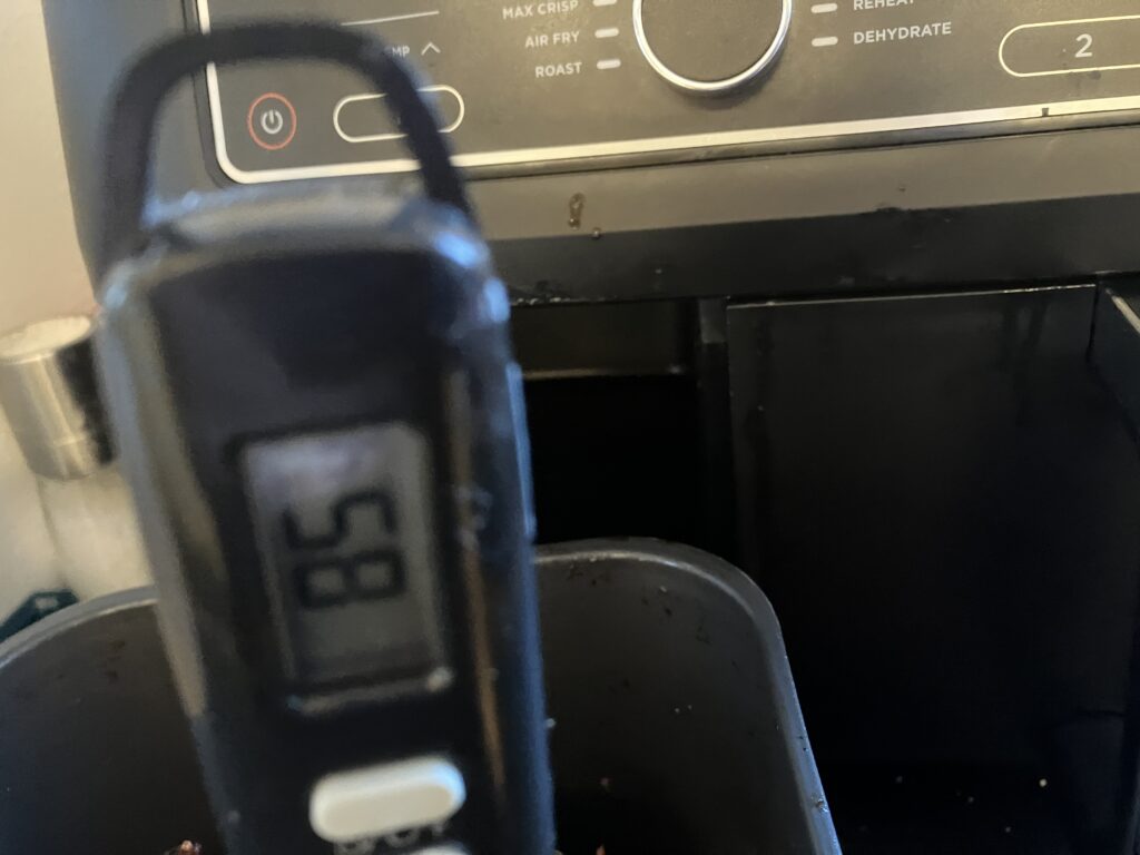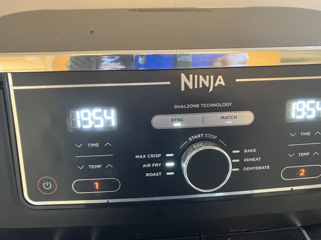 20 Minuten bei 200 Grad in der Airfry Position. Am Ende sollen es 40 Minuten von beiden Seiten sein.