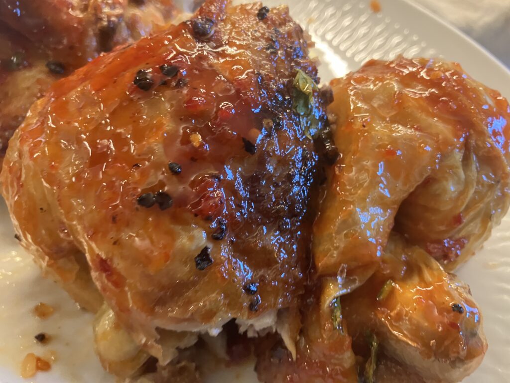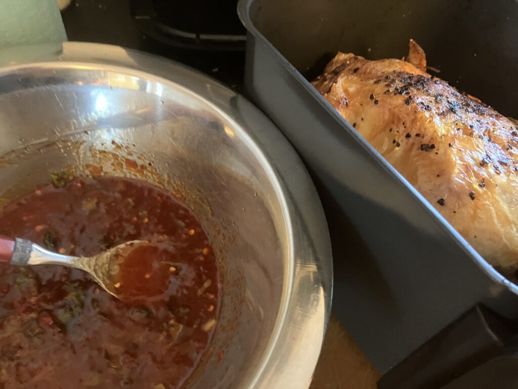Den Rest der Marinade verteile ich noch einmal auf dem Huhn. Die schmeckt ser ausgewogen süß-sauer und scharf
