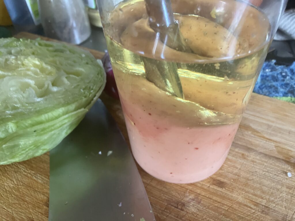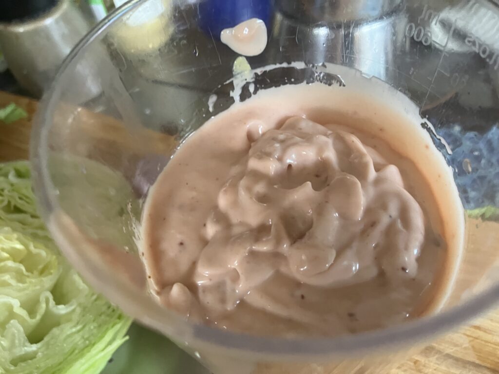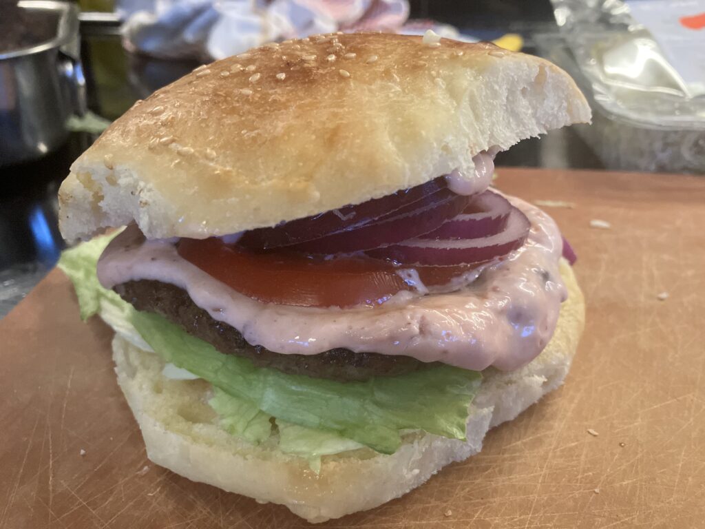 Beim Handelshof gab es Patties aus Hirschfleisch. Das hat mich dazu animiert Hamburger mit Hirschfleisch zu servieren. Ich lege dann auch Wert auf die Perepherie und das bedeutet für mich, die Beilagen nach einem roten Faden anzufertigen. Wild wird traditionell häufig mit Preiselbeeren serviert und zu Burgern gehört oft eine Mayonaisesoße, die man auf die entsprechenden Themen abstimmen kann. Das ist der Vorteil, wenn man alles selbst macht, dass man nicht ins Supermarktregal schauen muss was anderen dazu schon eingefallen ist, sondern dass man seine Assoziationen möglichst wunschgerecht selbst umsetzen kann. Die Preiselbeermayonnaise passt auch sehr gut zu zu Roastbeef, oder kaltem Braten und ist ein toller Dipp zu frischem Brot.