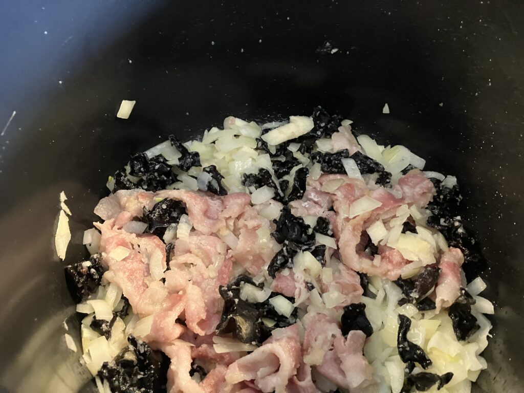 Jetzt kommen die Pilze hinzu. Normal wässert man die zuzerst, aber beim Druckkochen, kann man sich das sparen. Die 30 Gramm Pilze kosten normal sechs Euro. Ihr werde Euch wundern, wie die gleich aufgehen.