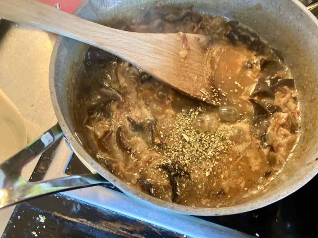 Die Soße kocht schön ein, aber mir fehlt noch etwas am Geschmack und bei der Farbe